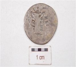 | Description / विवरण | A silver coin, round in shape, having tree motif on one side surface, another side surface is having unidentified motif tarnished surface. |