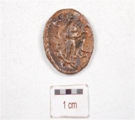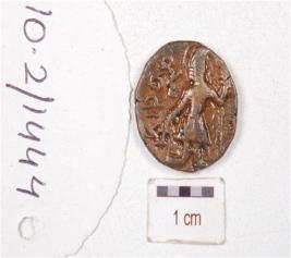 | Description / विवरण | A copper coin, round in shape image of human figure on surface, along with inscription, surface is chemically treated and preserved. |