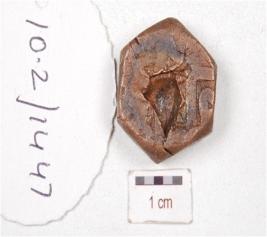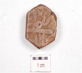 | Description / विवरण | A copper coin, hexagon in shape, inscription on surface, slightly chipped off from one side, surface is chemically treated and preserved. |