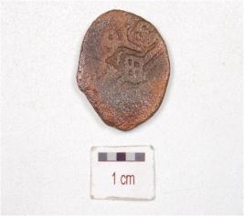 | Description / विवरण | A copper coin, round in shape, unidentify motif on surface is chemically treated and preserved. |