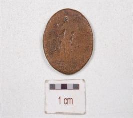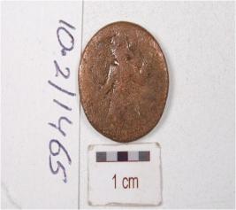 | Description / विवरण | A copper coin, round in shape, human figure on both side of surface, surface is chemically treated and preserved. |