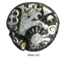 | Description / विवरण | Obverse Oval shaped coin shows sun, moon and tree symbols and others are not clear. Rev Blank |