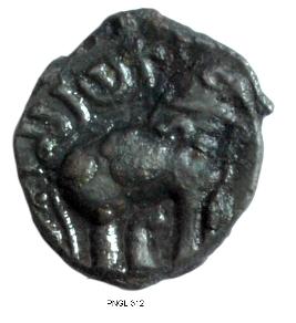 | Description / विवरण | Obverse Elephant standing with upraised head and hanging trunk. The tail is prominently shown, above the animal is a legend reading si ri ra no ya jna satakarni Rev Ujjain symbol The coin is fixed to the display board. |
