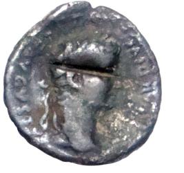 | Description / विवरण | Circular silver roman coin with horizontal cut mark on the base. Obverse Laureate head to right, V Ti Caesar DIVI XI Aug F. Augustus, Horizontal cut mark. Reverse Livia seated to right on chair holding inverted spear, IV pontiff X Maxim. |