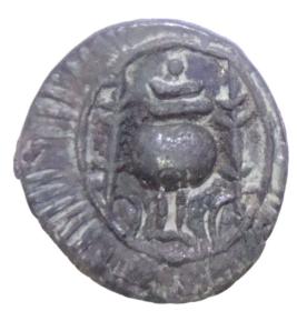 | Description / विवरण | Lot No. 6 1984, 11 Circular coin. Obverse Lion facing right with mouth open, fore paw raised, tail uplifted and curved, a crescent above the animal. Srivatsa symbol before the animal enclosed in a circle. Reverse A kalasa on a stand flanked by two lamp stands with in a raised circle. |