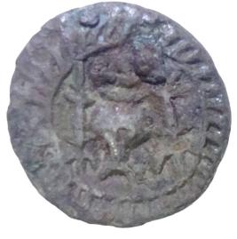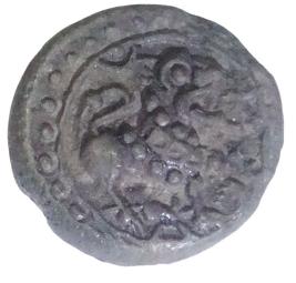 | Description / विवरण | Lot No. 6 1984, 14 Circular coin. Obverse A lion facing right with mouth open, fore paw raised and tail lifted, a crescent with dot above the animal, a Srivatsa symbol before the animal. It is enclosed in a circle along with dotted circle. Reverse A Kalasa on a stand flanked by two lamp stands within a circle. |