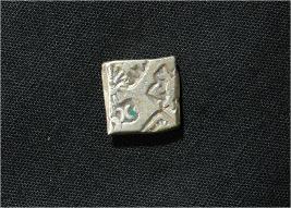 | Description / विवरण | The squre shaped coin depicts sun,an animal figure,sixarmed,three picked hill with cresent in the obverse and an unidentified symbol in the reverse. |