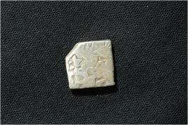 | Description / विवरण | The squre shaped coin depicts sun, animal figure, six armed,three picked hill with cresent at the top in the obverse and three unidentified symbols visible in the reverse. |