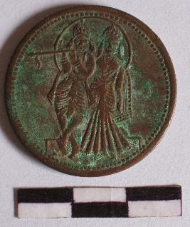 | Description / विवरण | The half anna coin was used during the rule of East-India Company. The obverse of the coin shows standing image of Radha- Krishna . Krishna is playing flute and a halo is placed over their head. East India Company and year 1616 has been depicted of the reverse of the coin. |