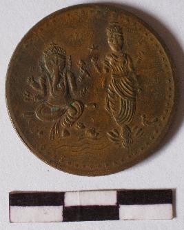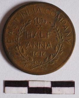| Description / विवरण | The half anna coin was used during the rule of East-India Company. The obverse of the coin shows image of Lakhsmi and Ganesha . Four armed deity Lakhsmi standing on a full bloomed lotus with her attributes. Lord Ganesha is sitting on a throne with all his attributes in his four hands. Both of them are highly ornamented. East India Company and year 1616 has been depicted of the reverse of the coin. |