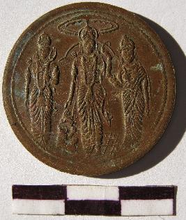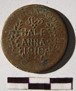 | Description / विवरण | The half anna coin was used during the rule of East-India Company. The obverse of the coin shows image of Lord Rama in the centre, holding his bow in the left hand and right hand rests on the Hanumana s head. Sita and Lakhsmana is also visible beside the Rama . They are highly ornamented. Hanumana in seated posture is also visible beside Rama . East India Company and year 1818 has been depicted of the reverse of the coin. |