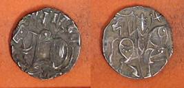 | Description / विवरण | Descrpn./Obv Recumbent bull facing left, wearing jhula (saddle cloth), with trisula (trident) symbol on rump. Above, legend in Sarada script Sri Samantadeva . Descrpn./Rev Rider with lance on caparisoned horse facing right. On left, Sarada letter bhi and on right, Sarada letter ta |