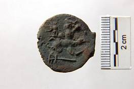 | Description / विवरण | Obverse- Bull to left before Jayadhvaja, four taurines placed back to back behind the animal at the top. Reverse- Tree in railing placed on a mount in the centre, tourine on the left above a wheel, Ujjain symbol on the right above and a Swastika below it. |