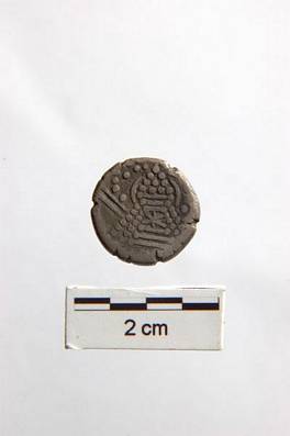 | Description / विवरण | Indo-Sassanian coin. Obverse crude human figure and several dots and lines. Reverse Fire altar made of the three lines below and a star above these. Two rounds of dots on either side from below to the top of the star. Again three lines above the star and leap of dots arranged above enclosed inside a bracket. |