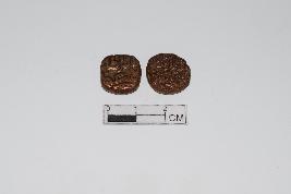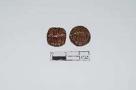 | Description / विवरण | These are two copper coins. They are inscribed on both the reverse and the obverse sides. One of the coins is circular while the other one is square in shape. |
