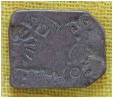 | Description / विवरण | The shape of the coin is hexagonal. Obverse Caduceus, Sun, six armed wheel and two taurines within a rectangular box. Reverse An indistinct symbol. |