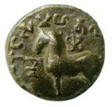 | Description / विवरण | Clear Horse symbol with legend and Srivasta mark above the animal. Obverse Horse standing to its right with slightly raised ears, Srivatsa symbol above and triangle headed standard symbol in front. The legend ba la Kuta sa ma ha ta la starts from 90 clock and ends at 20 clock. Reverse Three arched hill with 6 dots in lower two arches and 4 dots in the top arch and a wavy line below. All are enclosed by a double line square. A triangular standard symbol above the 3 arched hill. |