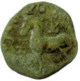 | Description / विवरण | Horse symbol with slightly abraded legend. Back leg portion is cut off. Obverse Horse standing to its right with slightly raised ears, Srivatsa symbol above and triangular standard in front. The legend reads la ku ta sa ma ha ta.. Reverse Three arched hill with 6 dots in two lower arches and 4 dots in the top arch and a wavy line below. All are enclosed by a double line square. |