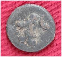| Description / विवरण | The Shape of the Coin is Circular. Obverse A Standing figure of Kushana type king, hands are not visible. Reverse Probably a standing figure of MAO or Moon-God with extended right hand and folded left hand, the crescent above the left shoulder. |