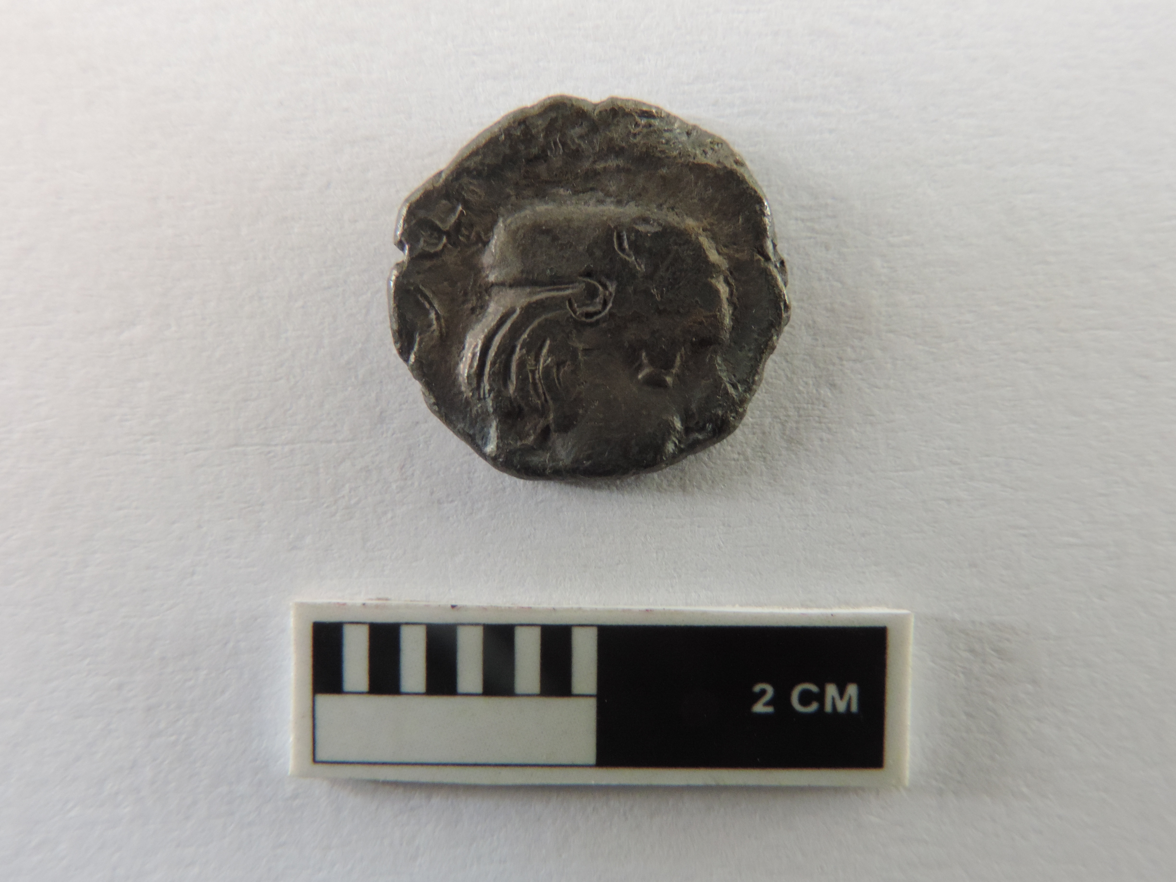 A (drachm) silver coin of Western Kshatrapa ruler. On one side, at the centre, is a chaitya (3-arched hill) with a river below, a sun and a moon at the top and a Brahmi legend around it. On the other side is the face of a man, probably the ruler, and surrounding it on one side visible, are some Greek letters.