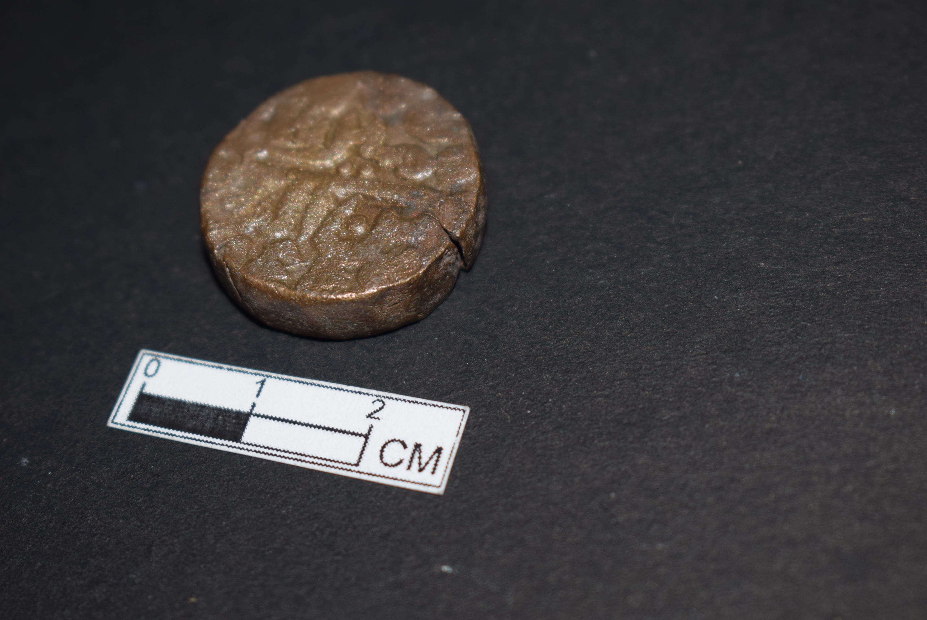 It is a circular coin. It is made of copper. It is inscribed on both sides. The inscription on the edges is slightly worn off. It belongs to Islam Shah of the Sur dynasty.