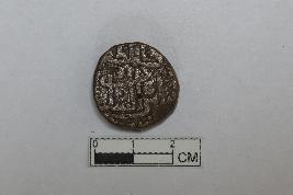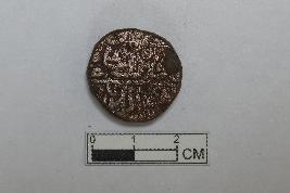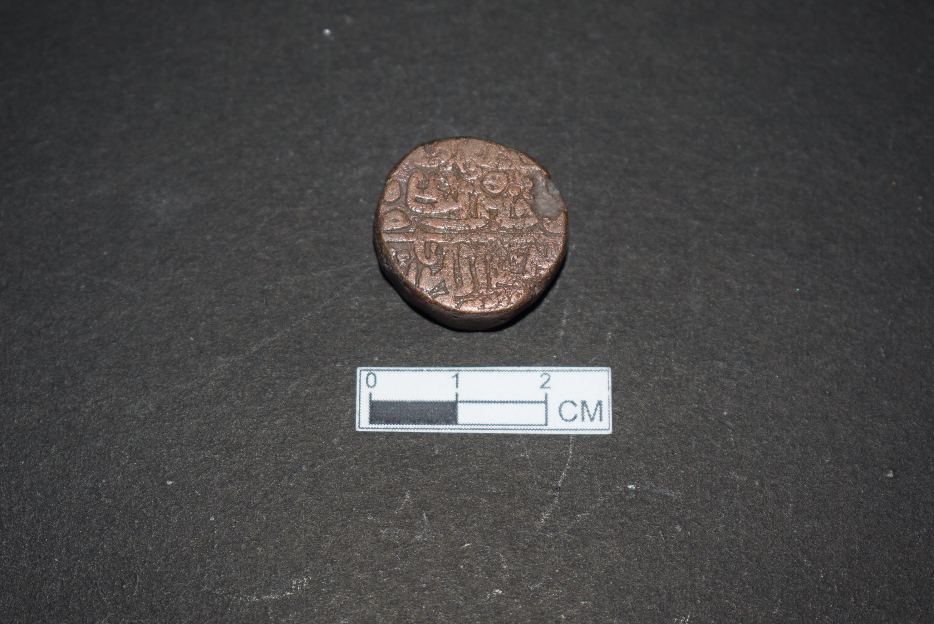 It is a circular coin. It is made of copper. It is inscribed on both sides. It belongs to Sher Shah of the Sur dynasty.