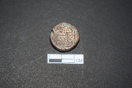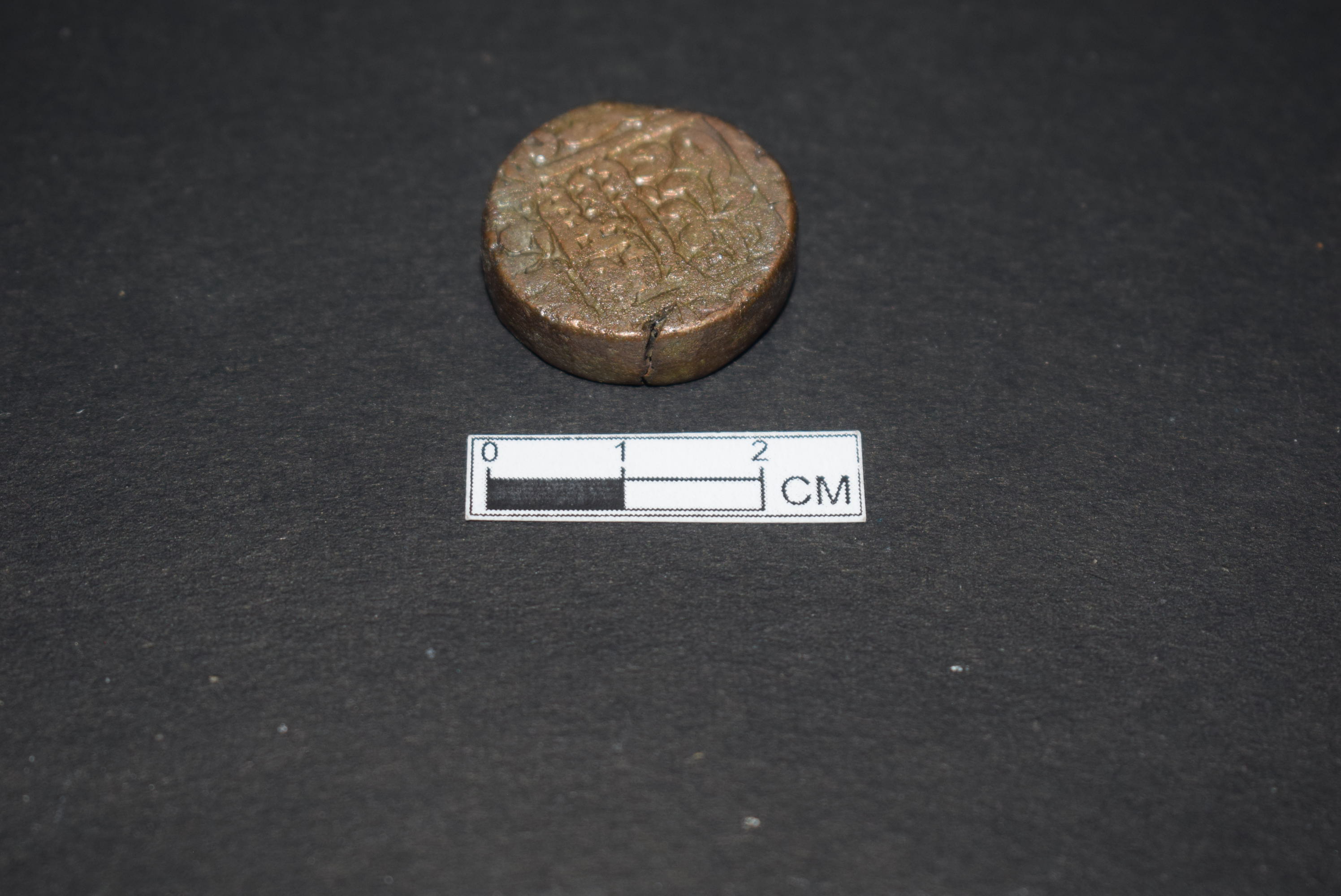 It is a circular coin. It is made of copper. It is inscribed on both sides. The inscription has worn off a little on the sides. It belongs to Sher Shah of the Sur dynasty.