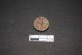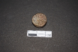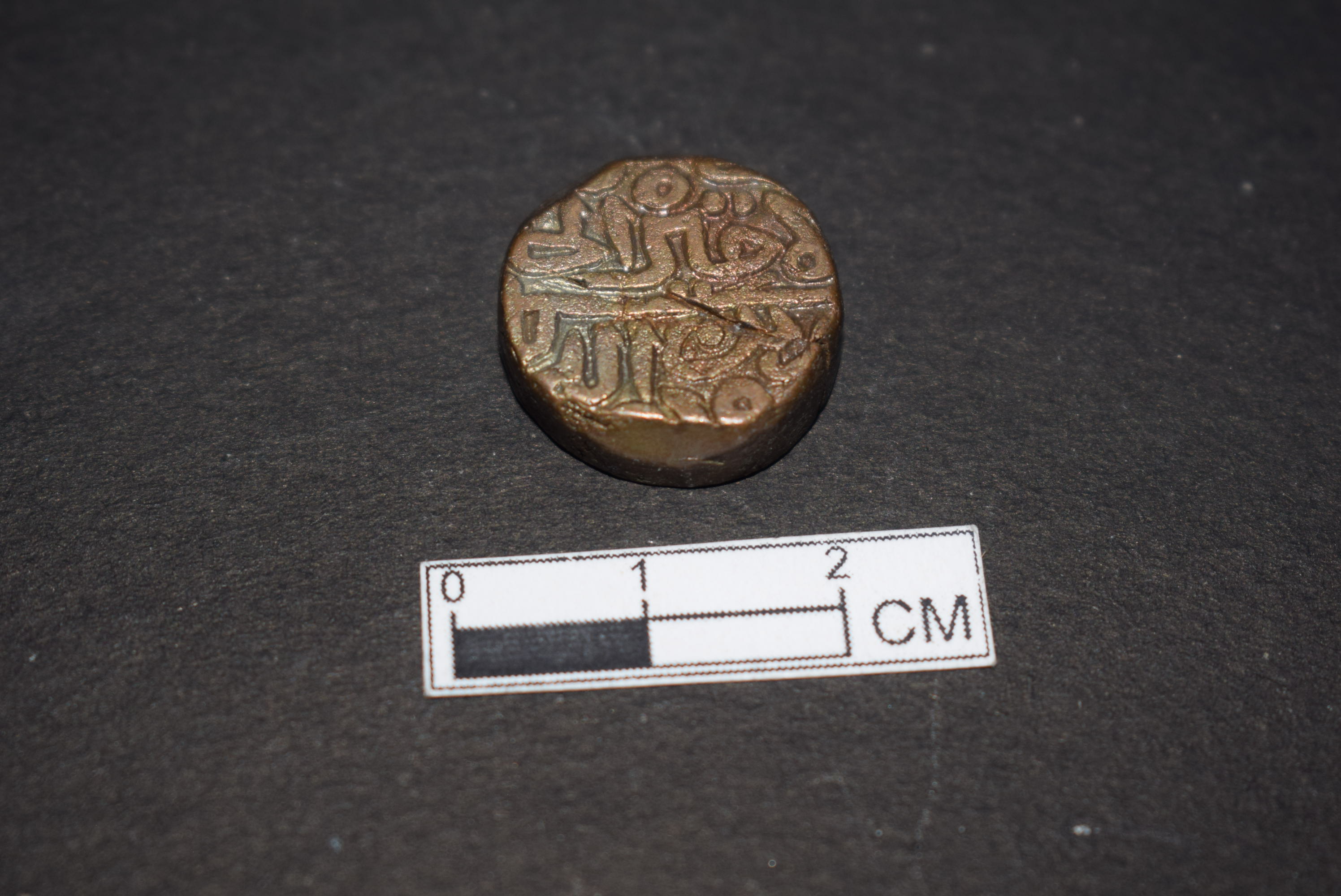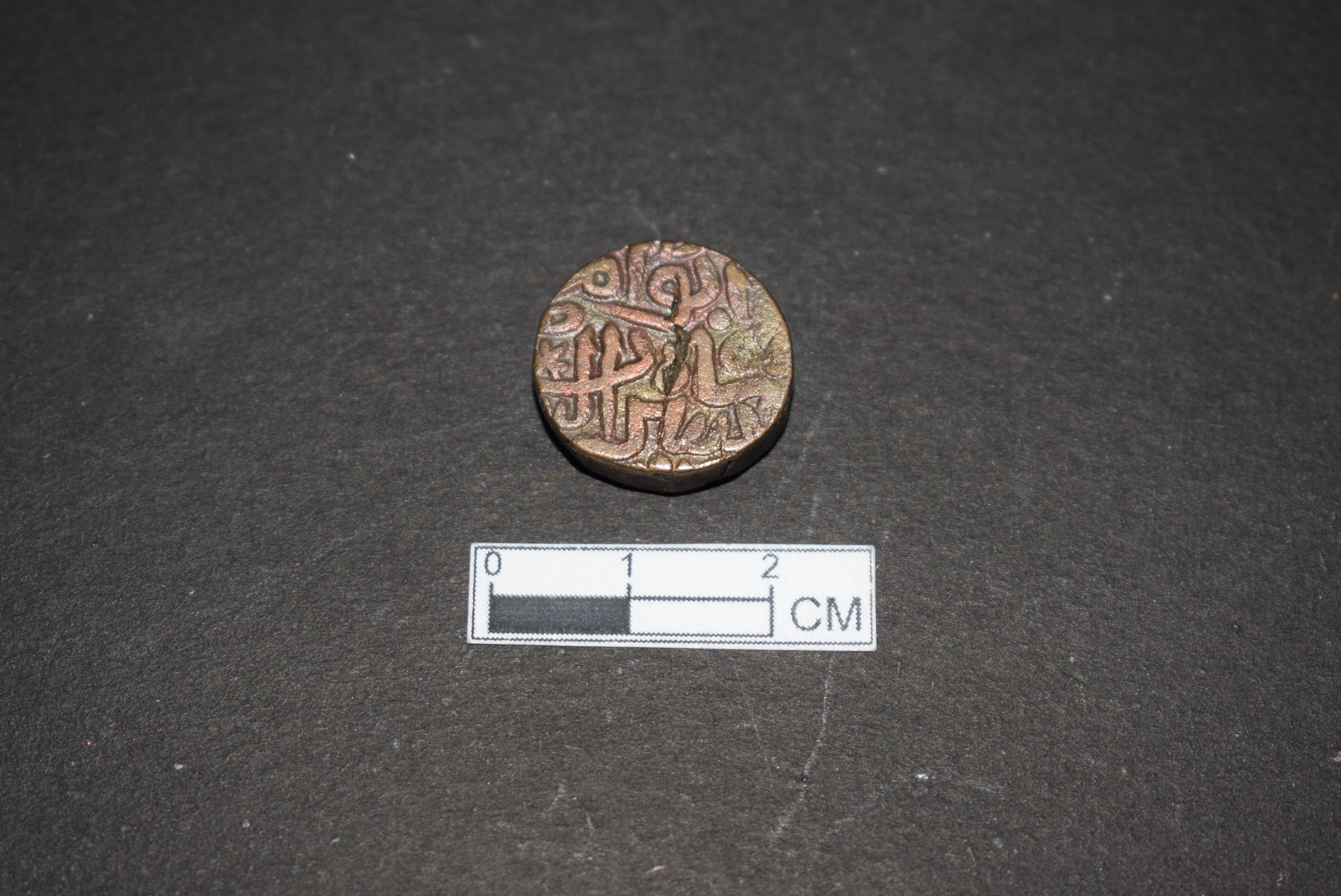 It is a circular coin. It is made of copper. It is inscribed on both sides. It belongs to Sher Shah of the Sur dynasty.