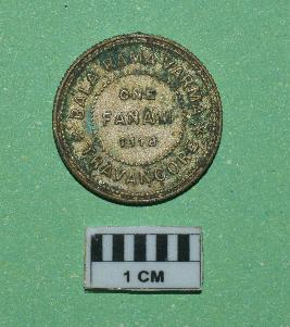 | Description / विवरण | Round shaped copper coin. The coin was issued by Bala Rama Varma. Obverse - Conch in a circle, decorated with flower design. Reverse - ONE FANAM 1118, within circle of circular dots, and outside of circle name of the king BALA RAMA VARMA. TRAVANCORE, written in English. |