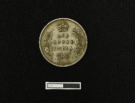 | Description / विवरण | A circular shaped silver coin. Obv. Bust of King Edward VII facing right dividing a legend within a raised and toothed border. Script EDWARD VII KING & EMPEROR. Rev. The value in English and Urdu - Ek rupiya (One rupee) and the year below with a spray of lotus flowers on each side and a crown above, all within a raised toothed border. Script ONE RUPEE INDIA 1904 |