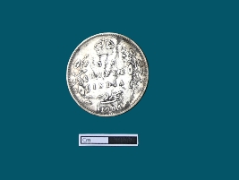 | Description / विवरण | A silver coin with a circular shape. Obv. Bust of King Edward VII facing to the right, dividing a legend within a raised and toothed border. Script EDWARD VII KING & EMPEROR. Rev. The coin bears the denomination in both English and Urdu - Ek rupiya (One rupee) along with the year. Surrounding these elements are a spray of lotus flowers on each side and a crown above, all enclosed within a raised, toothed border. Script ONE RUPEE INDIA 1904. Green patination is visible. Black patches are visible. |