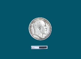 | Description / विवरण | A circular shaped silver coin. Obv. Bust of King Edward VII facing right dividing a legend within a raised and toothed border. Script EDWARD VII KING & EMPEROR. Rev. The value in English and Urdu - Ek rupiya (One rupee) and the year below with a spray of lotus flowers on each side and a crown above, all within a raised toothed border. Script ONE RUPEE INDIA 1904 Black patches are visible. |