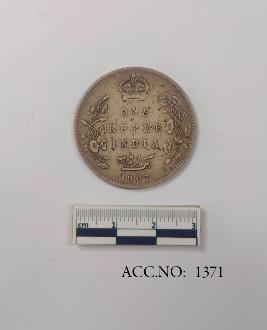 | Description / विवरण | It is a One rupee coin of British India. The obverse of the coin has a bust profile of King Edward VII. The legend of the coin states EDWARD VII KING & EMPEROR. This is encircled within a beaded circle that runs along the rim of the coin. The reverse of the coin has a Latin script that states the denomination of the coin -ONE RUPEE INDIA . which is followed by a Persian script . Beneath the Persian script the year of the coin 1907 is depicted. A foliage decor is flanked on both the sides of the script. All of which is enclosed within a beaded decor that runs along the rim of the coin. |