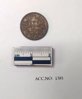 | Description / विवरण | It is a two Anna coin of British India.The obverse of the coin has a bust profile of queen Victoria. The legend of the coin states VICTORIA QUEEN. This is encircled within a beaded circle that runs along the rim of the coin. The reverse of the coin has a Latin script that states the denomination of the coin TWO ANNAS followed by a Persian script. The script is encircled by a olive wreath decor. Beneath the wreath the year of the coin 1841 is seen. The legend of the coin states- EAST INDIA COMPANY. A beaded circle decor runs along the rim of the coin. |
