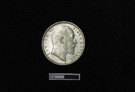 | Description / विवरण | A silver coin with a circular shape. Obv. Bust of King Edward VII facing to the right, dividing a legend within a raised and toothed border. Script EDWARD VII KING & EMPEROR. Red patches are visible. Rev. The coin bears the denomination in both English and Urdu - Ek rupiya (One rupee) along with the year. Surrounding these elements are a spray of lotus flowers on each side and a crown above, all enclosed within a raised, toothed border. Script ONE RUPEE INDIA 1904. |