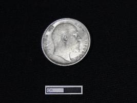 | Description / विवरण | A circular shaped silver coin. Obv. Bust of King Edward VII facing right dividing a legend within a raised and toothed border. Script EDWARD VII KING & EMPEROR. Rev. The value in English and Urdu - Ek rupiya (One rupee) and the year below with a spray of lotus flowers on each side and a crown above, all within a raised toothed border. Script ONE RUPEE INDIA 1904. |