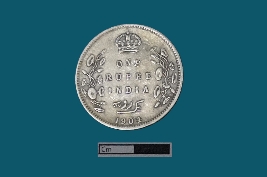 | Description / विवरण | A silver coin with a circular shape. Obv. Bust of King Edward VII facing to the right, dividing a legend within a raised and toothed border. Script EDWARD VII KING & EMPEROR. Rev. The coin bears the denomination in both English and Urdu - Ek rupiya (One rupee) along with the year. Surrounding these elements are a spray of lotus flowers on each side and a crown above, all enclosed within a raised, toothed border. Script ONE RUPEE INDIA 1904. |