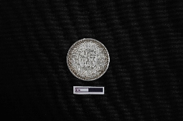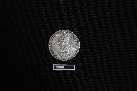 | Description / विवरण | A silver coin, circular in shape, displays on its obverse side the left-facing bust of King George V, separating a legend within a raised and toothed border, inscribed as GEORGE V KING EMPEROR. On the reverse side, the date is encircled by a divided legend in both English and Urdu (ek Rupya), while outside the circle, a wreath formed from roses, thistle, shamrock leaves, and lotus flowers embellishes the design, all enclosed within a toothed border, with the script reading ONE RUPEE INDIA 1916. |