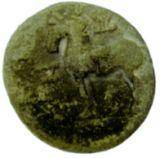 | Description / विवरण | Horse symbol with legend abraded. Three arched hill partly cut off. Obverse Horse with slightly raised ears standing to its right, Srivatsa symbol above and triangular standard in front. The legend reads la ku. Reverse Three arched hill with 6 dots in two lower arches and 4 dots in the top arch and a wavy line below. All are enclosed by a double line square. |