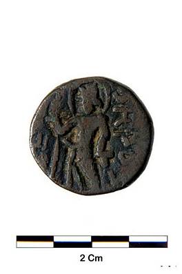 | Description / विवरण | Obverse- Kushan king seated. Reverse- Standing human figure having a halo around his head. Greek legend on the right OPHPO fire god. |