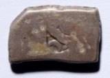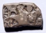 | Description / विवरण | Punch marked coin, rectangular with one side round Obverse Sun, Six ared symbol arrow and taurine alternately , three peaked hill with crescent, square box with increasing lines on left corner, elephant on a line and another creature under the line. Reverse Taxila marks GH no. 573 VI IV F 26 |