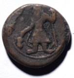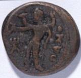 | Description / विवरण | Round Obverse Standing king wearing a coat and trousers, facing left, holding a standard in left hand and offering in a fire altar by right hand. Part of legend in Greek Reverse a four armed deity holding different objects in each hand. Legend in Greek Oesho Isha Shiva . Kushana monogram is on the left side. |
