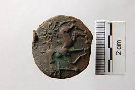 | Description / विवरण | Obverse- Bull to left before Jayadhvaja, four taurines placed back to back behind the animal at the top. Reverse- Tree in railing placed on a mount in the centre, tourine on the left above a wheel, Ujjain symbol on the right above and a Swastika below it. |