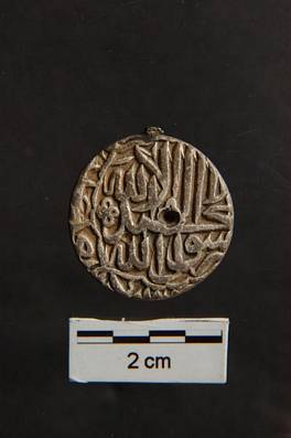 | Description / विवरण | Silver coin of Akbar. Obverse Inside foliated pentagon, the Kalima. Margins cut. Reverse Inside rectangle with each side made of from arches, the legend runs vertically from bottom Jalaluddin Muhammad Akbar Bad, Shah Ghazi. Date 983. Margins cut. |