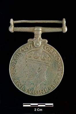 | Description / विवरण | Commemorative metal of George VI. Obverse Crowned portrait of the emperor l. Legend around the rim reads Georges VI G. BROMN. REXET INDIA EIMP. Reverse A spirited lion left trampling upon a seated animal having the beak of bird year 1939-1945 above the back of the lion. |