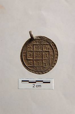 | Description / विवरण | Obverse Field covered by two swastikas interlaced, with legend and floral ornaments dispersed in compartments. Central legend Sri Sri Sri Locknath intermediate legend, Sri Sri Sri ., outer legend Sangeet Skilled in the dance or mantra. Reverse Field cover by a rhomboid and two equilateral triangles interlaces, with temple in centre and legend dispersed in compartments date below 806 N.S. 1686 A.D. Central legend, Sri Narandra Lakshmi Devi outer legend , Sri Pratab Lakshmi Devi. |