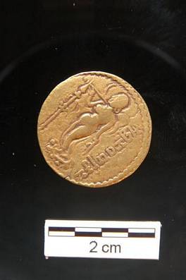 | Description / विवरण | Obverse - Uncaparisoned horse standing to left on a platform before a yupa, bent at the top. A pennon flies from the top of the yupa over the horse. The mane of the horse is plaited with a string of beads. There is also another string of beads over his back shown separately. There is also a crescent above. Letter si is under horse. Reverse - Queen standing to left. Nimbate. Wearing round earrings. She holds in the right hand a Chauri over right shoulder. A bead bordered mat or lotus under feet of the queen. Sacrificial Suchi before queen. Dotted border all-around. Legend on the right Ashwamedha prakrawah . |