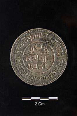 | Description / विवरण | Obverse Legend along the border Mahraja . Centre circle enclosing a trident, moon and legend Kori Pach 1941. Reverse Ornament border and dotted margin Urdu legend - Daksori, Kaisar hind, Zerb- Bhuja. 1884. |