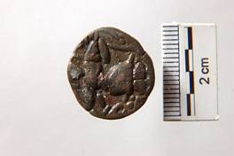 | Description / विवरण | Obverse- An unidentified human figure in standing with his wide hands. Reverse- Goddess seated. Here is no legend on the coin. Diamt 1.9 cms. |