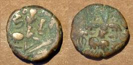 | Description / विवरण | Descrpn./Obv Stylised seated Goddess facing; Sharada legend, Ha (on l.) rsha ra (on r.). Descrpn./Rev Stylised standing king design; Sharada legend, jadeva (on r.) |